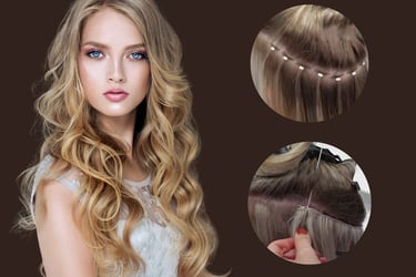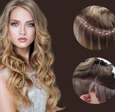 Eine Braidless Weave ist eine Haarverlängerungsmethode, bei der keine Zöpfe als Grundlage geflochten werden. Entlang des Kopfes werden kleine Microringe in geraden Linien angebracht. Diese Microringe dienen als stabile Basis, auf die die Haartressen anschließend genäht werden.