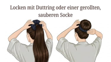 Anstatt Hitze zu nutzen, wird das Haar im feuchten Zustand um einen weichen Ring (eine saubere Socke oder ein fertiges Duttkissen) gewickelt. Während das Haar trocknet, nimmt es die runde Form an.